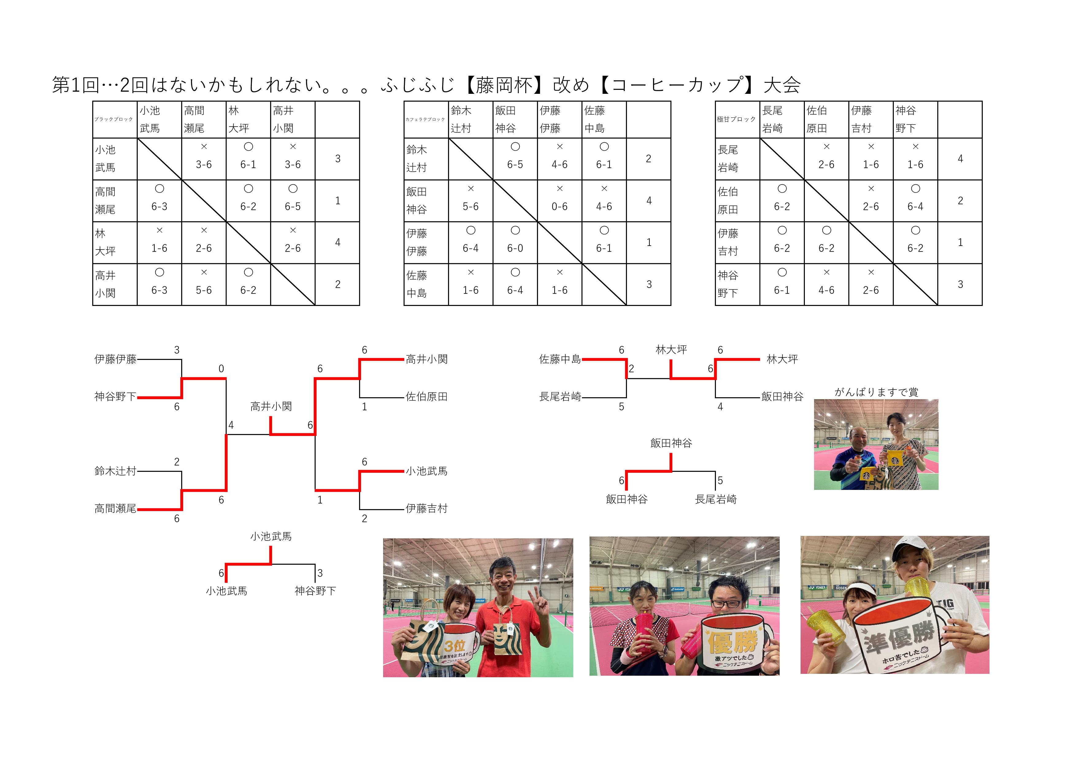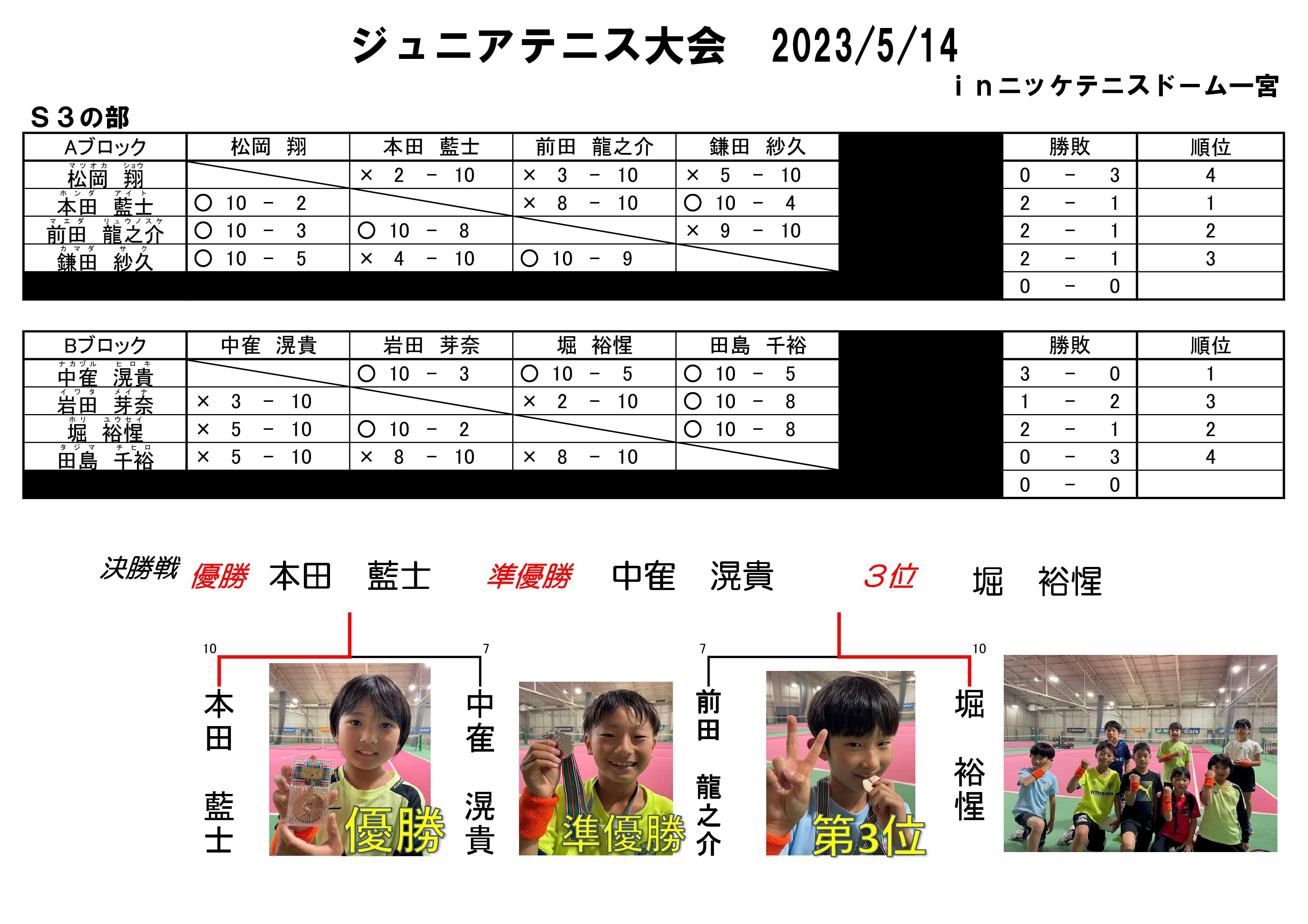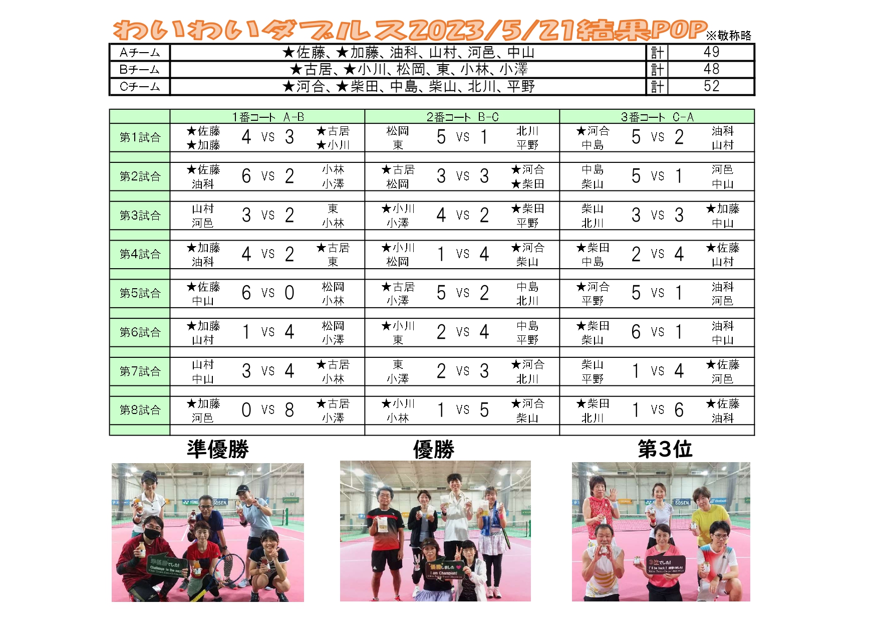 イベント&新着情報 ◆5/21 わいわいダブルス結果 2023年05月21日 結果がここまで差がつかなかった、珍しい回でした! 日頃のレッスンの成果を存分に発揮できたイベントになりました! ご参加いただきありがとうございました 次回、今後のイベントへの参加もお待ちしています! ◆5/14 ジュニアテニス大会 S2・S3 結果 2023年05月14日 ◆5/3 藤岡杯ミックスダブルス結果 2023年05月06日