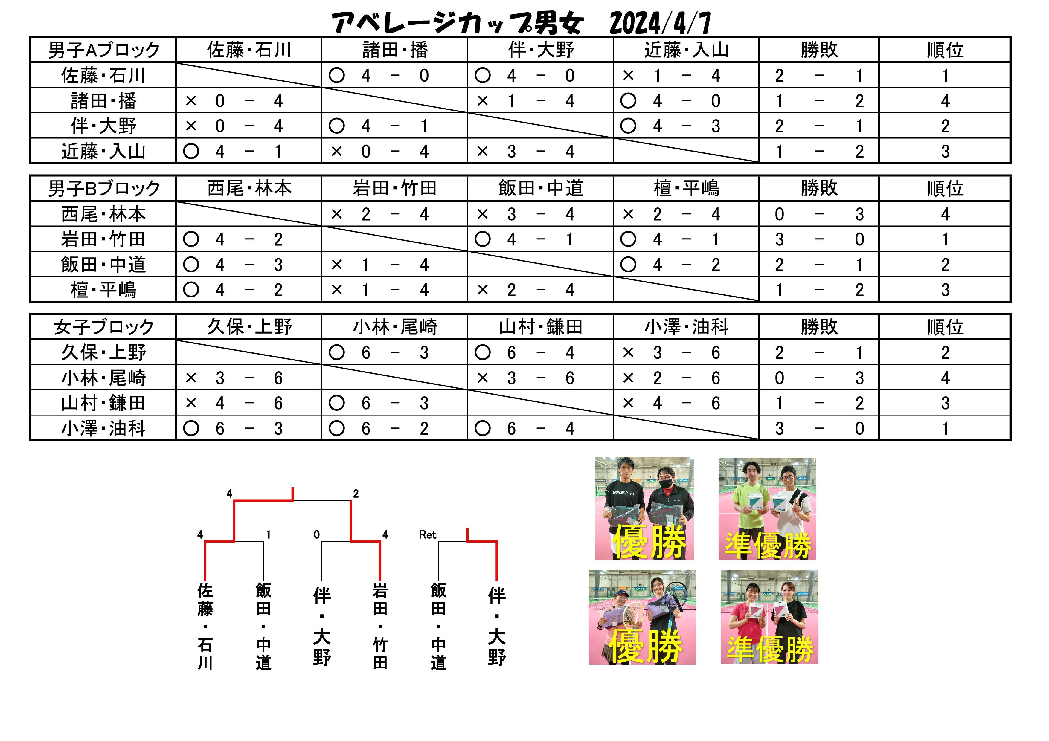 イベント結果 ◆4/28 男子ダブルス結果 2024年04月28日 ◆4/21 女子ダブルス結果 2024年04月21日 6/9 エンジョイダブルス 2024年04月19日 ◆アベレージカップ結果 2024年04月08日 多くのご参加、ありがとうございました! (募集人数の変更の為、男子は4ゲーム先取、女子は6ゲーム先取とルールを変更しました)