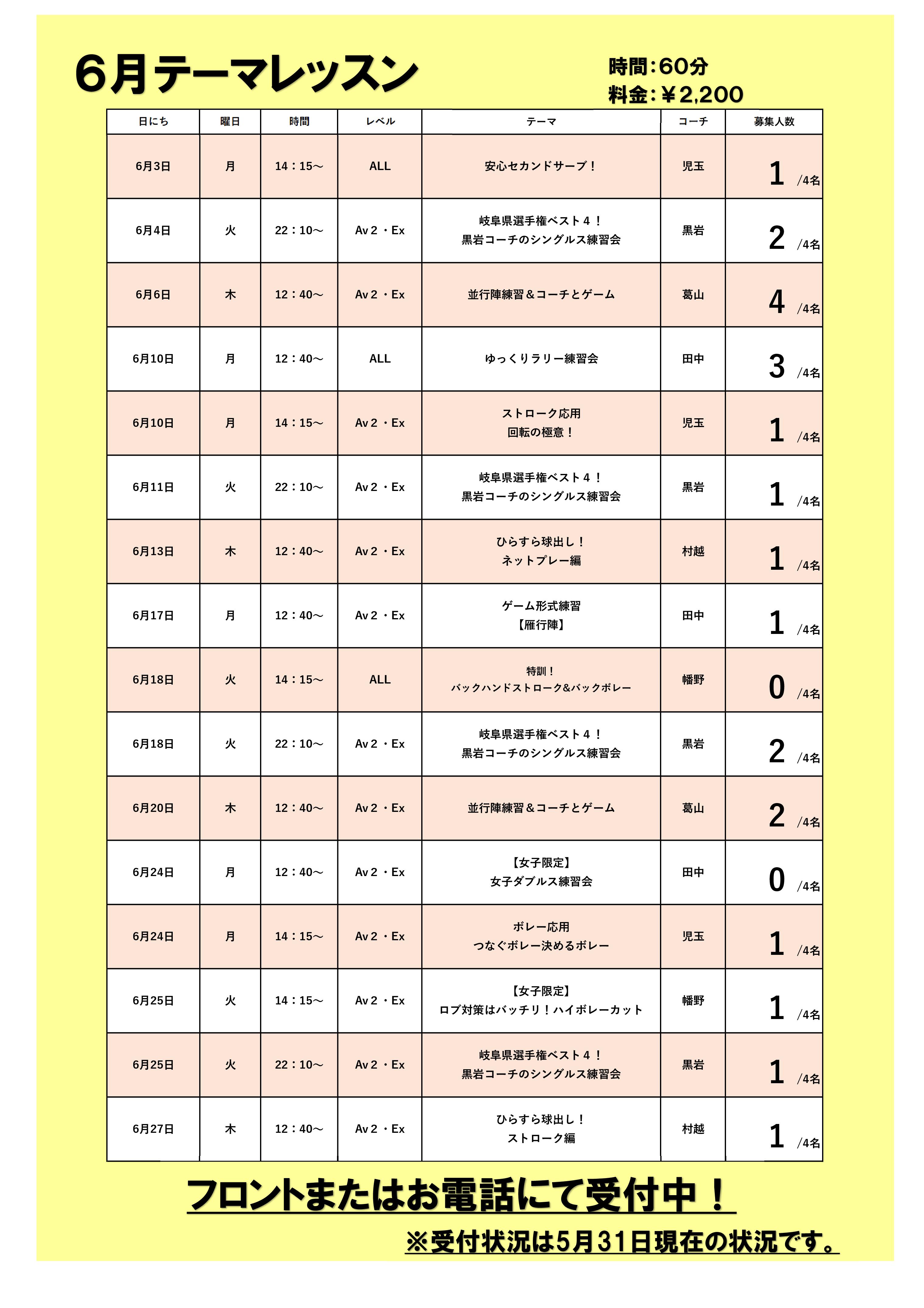 イベント&新着情報 6月テーマレッスン申し込み状況 2024年05月31日 6月のテーマレッスンの申し込み状況です! 少人数で空きがあるクラスもあるので、ぜひお申込みお待ち致しております。 « 7/7 サンデーテーマレッスン 7/21 アベレージカップ »