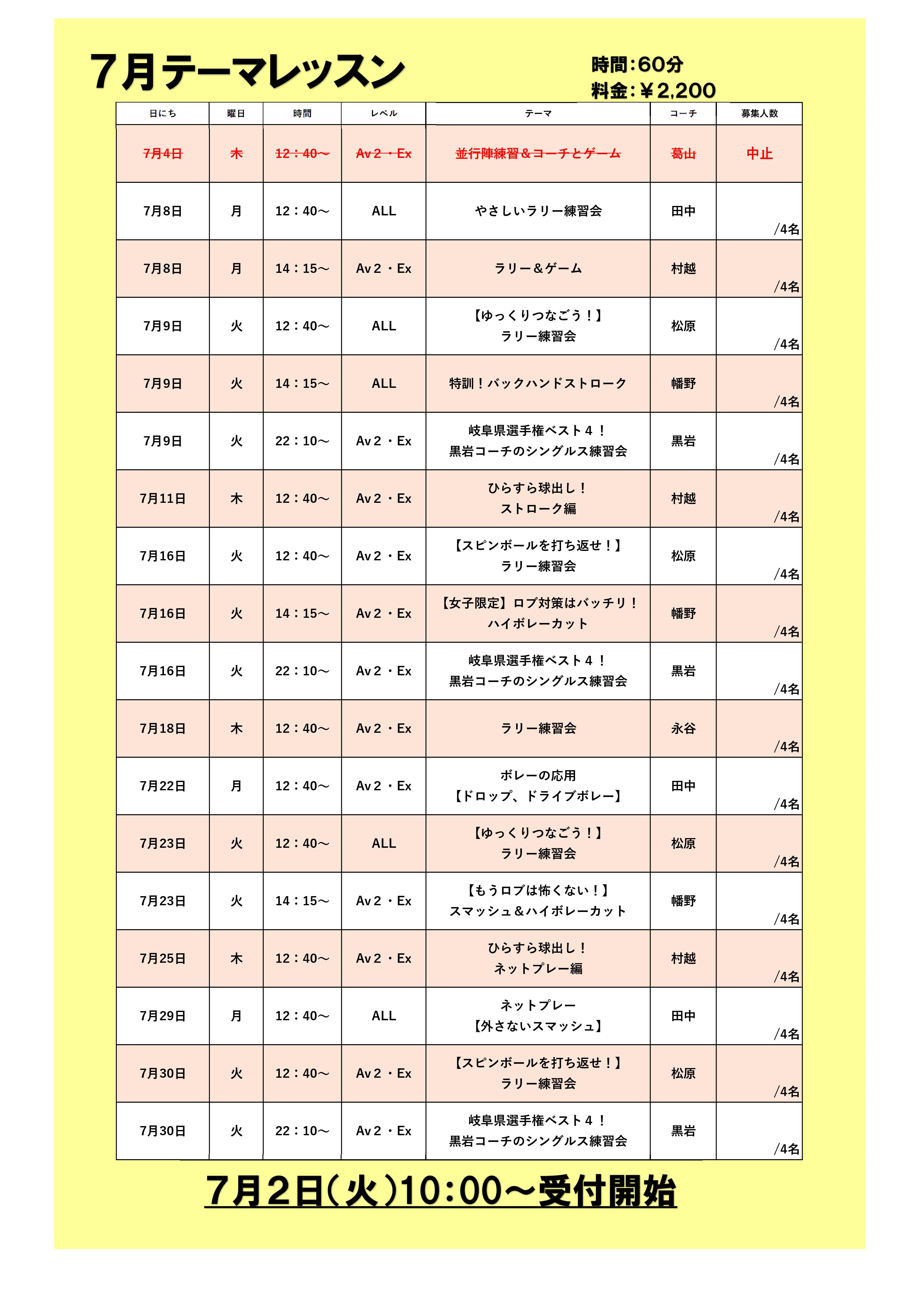 イベント&新着情報 7月テーマレッスン【変更のお知らせ】 2024年06月27日 7/4(木)のテーマレッスンについて、中止とさせていただきます。 ご迷惑をお掛けし申し訳ございませんが、ご理解のほどよろしくお願いいたします。 « 8/4 ラリー&ゲーム180 8/18 女子ダブルス »